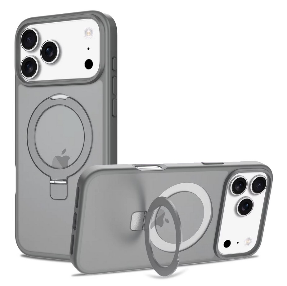 Clear crystal MagSafe case with built-in ring stand for secure grip, hands-free viewing, and magnetic charging support.